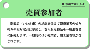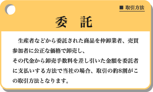 せり売は、買手である仲卸業者や売買参加者が値段をつけあい最高値が価格となり、ここで初めて商品の価格(卸売価格)が決まります。威勢のいい掛声が飛び交う中、せり落とされた商品は買手に引き取られます。相対売は売手(市場担当者)と買手が話し合いのうえ価格を決め、商品が引き取られます。仲卸店舗では売買参加者や買出人が買いやすいように商品を陳列し販売されたり、市内の店舗で一般の消費者のみなさんに販売されます。